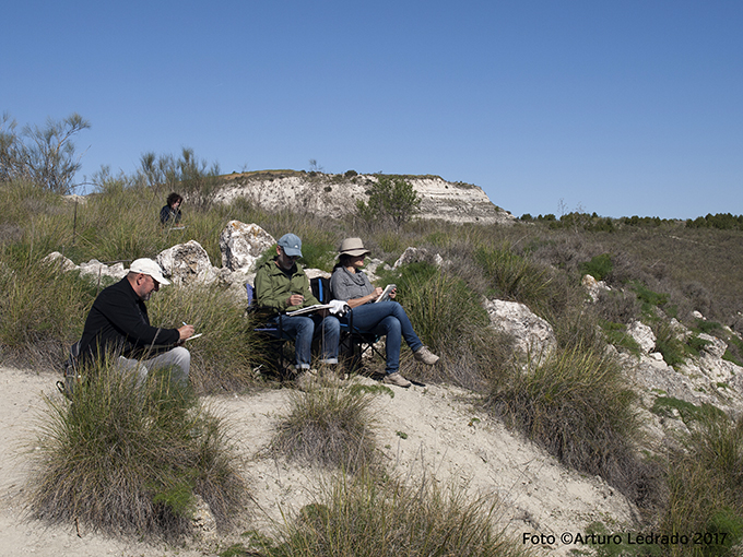 Nueva salida al aire libre del taller 2016/2017, para tomar apuntes desde los cantiles de El Piul, con la laguna El Campillo, la vega del río Jarama y los altos de Morata y San Martín al fondo. Los cantiles, además de una atalaya natural, son también el hábitat de numerosas especies de aves, que anidan en las repisas y contrafuertes de estas formaciones naturales tan características de los cursos bajos del Manzanares y el Jarama.