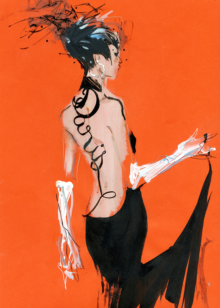 La ilustración que abre esta entrada corresponde a la colección otoño-invierno 2000 de Gaultier París. El dibujo original, que se ha editado posteriormente mediante técnicas digitales, lo realizó Downton con pastel al óleo, tinta y guache sobre papel con una capa de acetato.