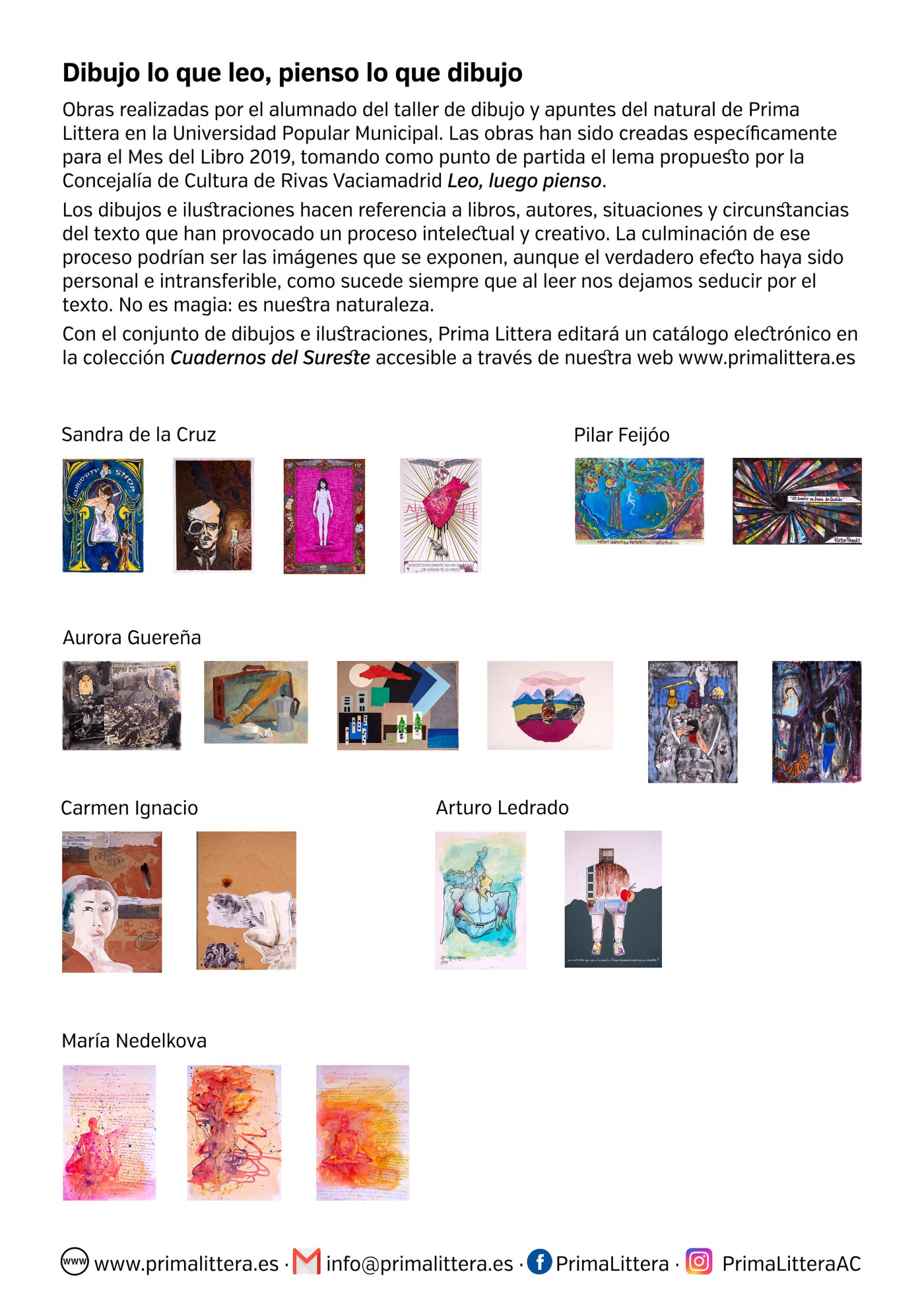 Con el título Dibujo lo que leo, pienso lo que dibujo, el taller de dibujo y apuntes del natural de Prima Littera participa en la muestra organizada por la Concejalía de Cultura de Rivas Vaciamadrid, incluida en el programa de actividades del Mes del libro. Las obras han sido creadas específicamente para esta exposición conjunta, tomando como punto de partida el lema propuesto por la Concejalía de Cultura de Rivas Vaciamadrid Leo, luego pienso.