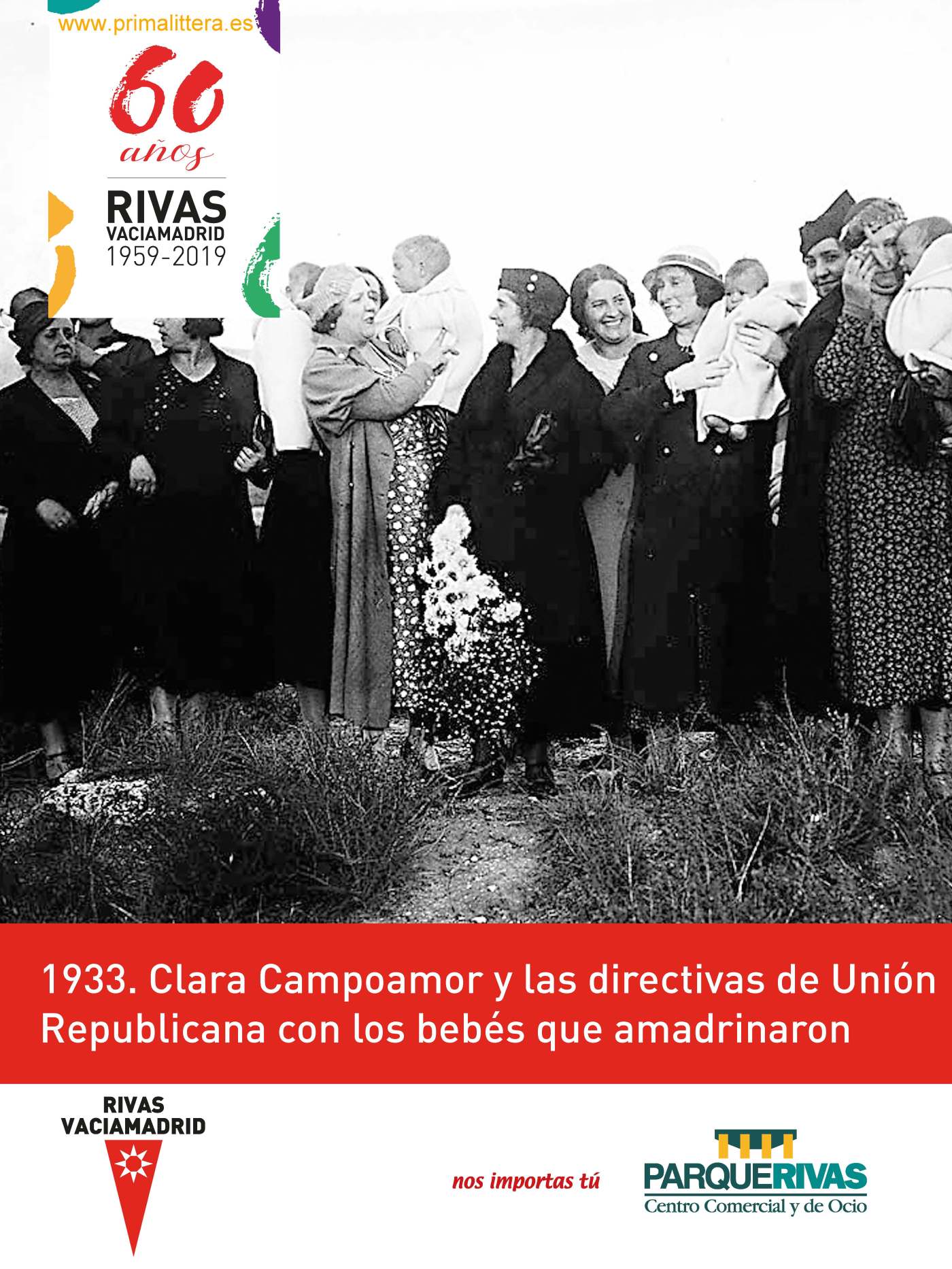 Clara Campoamor y la directiva del partido Unión Republicana Femenina asistieron, el 30 de septiembre de 1933, a la entrega del primer grupo provincial de cunas a la casa-cuna de Rivas Vaciamadrid.