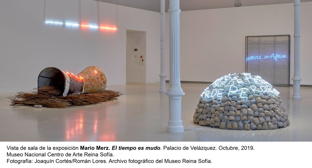 El Museo Reina Sofía presenta El tiempo es mudo, una muestra retrospectiva de Mario Merz. La exposición, organizada en colaboración con la Fondazione Merz, ofrece un recorrido por las distintas vertientes del trabajo del artista a través de una selección de más de medio centenar de piezas que atraviesan toda su trayectoria: desde sus primeras obras abstractas de los años 50, hasta las últimas de los 90. Las obras proceden de instituciones como la Tate Modern de Londres, el Centro Pompidou de París y el Kuntsmuseum Wolsburg, y también de numerosas colecciones particulares