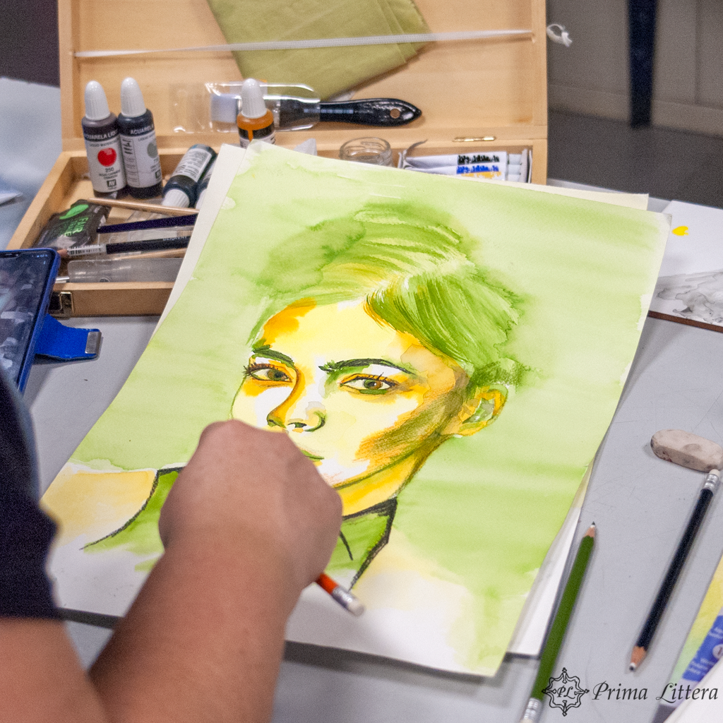 Nueva sesión del monográfico de retrato con acuarela y lápices de colores, dirigido por Zaida Escobar, en el taller de dibujo y apuntes del Espacio de Arte Prima Littera en la Universidad Popular municipal de Rivas Vaciamadrid.