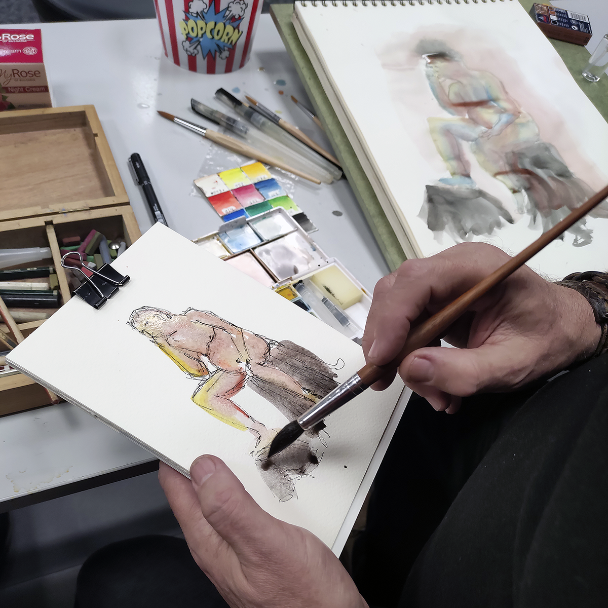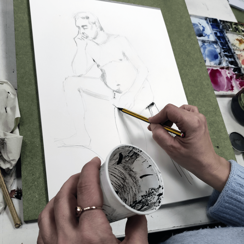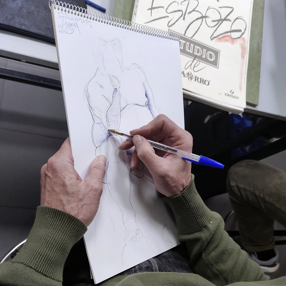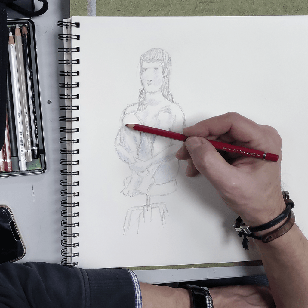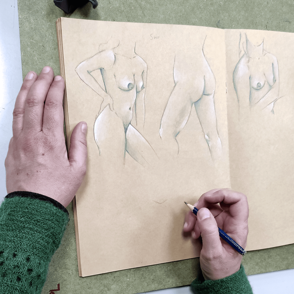 Selección de apuntes del natural con modelos realizados durante enero de 2023 en el aula abierta de Prima Littera en Rivas Vaciamadrid. Los apuntes corresponden a poses entre cinco y veinte minutos de duración. Los materiales empleados incluyen lápices de grafito y carbón, acuarelas, tintas, barras y pasteles.