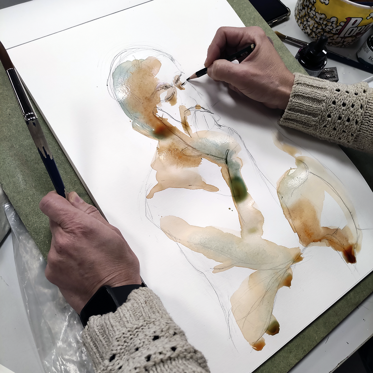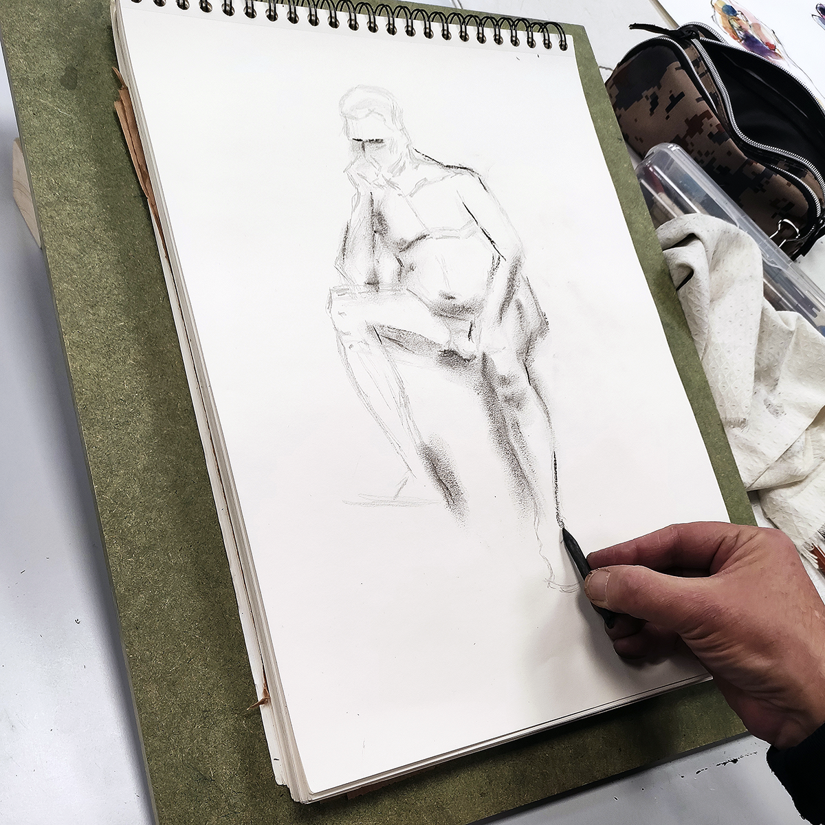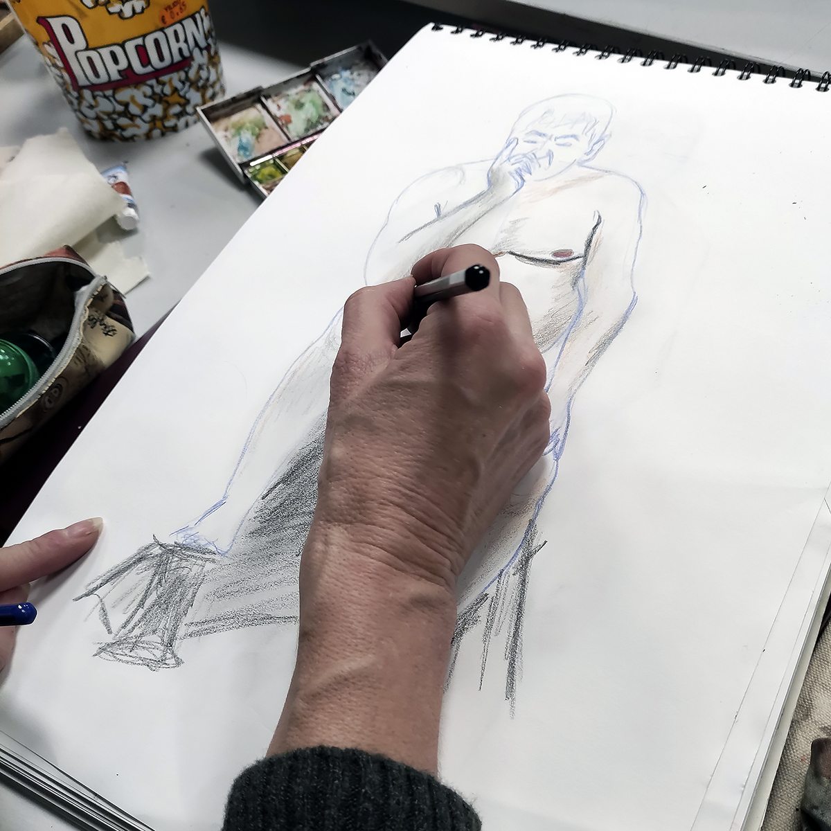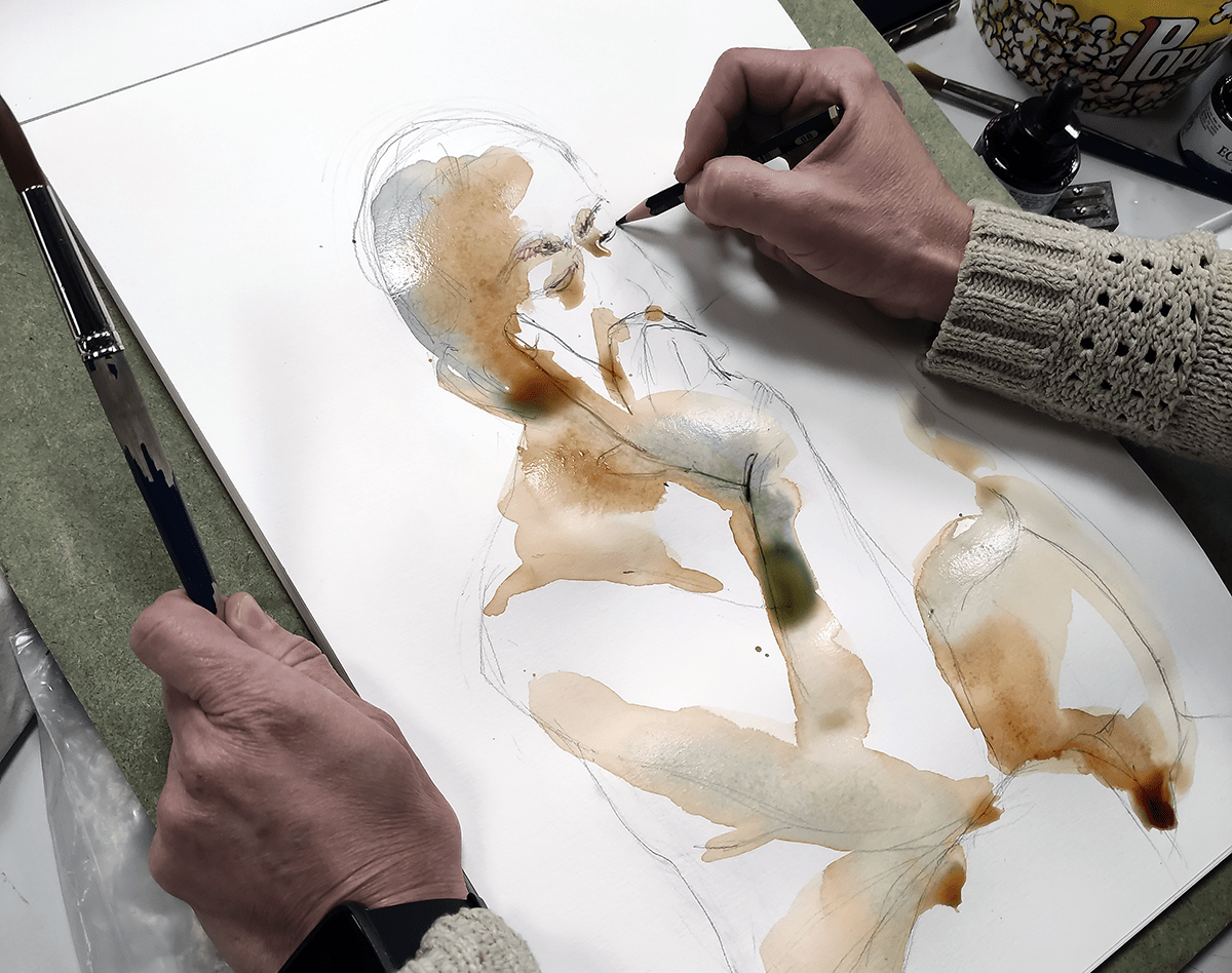 Selección de apuntes del natural con modelos realizados durante enero de 2023 en el aula abierta de Prima Littera en Rivas Vaciamadrid. Los apuntes corresponden a poses entre cinco y veinte minutos de duración. Los materiales empleados incluyen lápices de grafito y carbón, acuarelas, tintas, barras y pasteles.